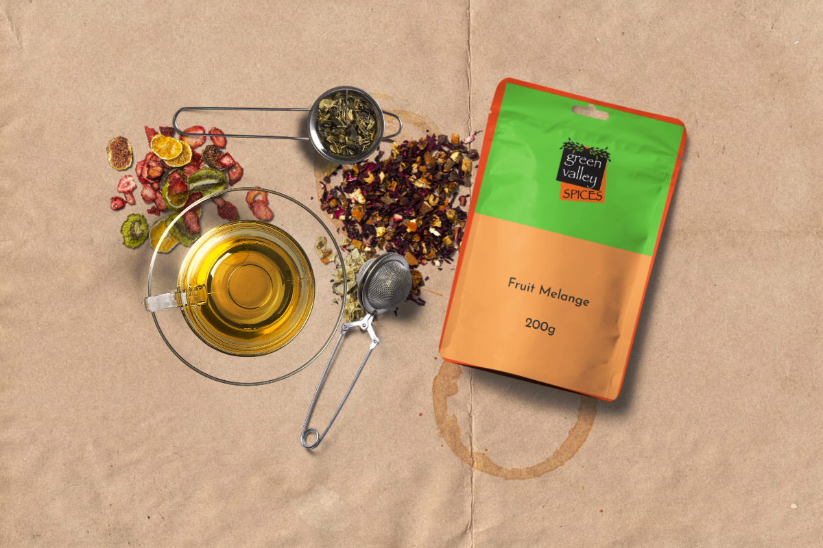 Naturally Flavoured Fruit Melange Fresh, Brisk And Fruitty With The Taste Of Natural Lemon And Lime Flavours. Ingredients : Apple Bits Rose- Hip Peels, Apple Slices, Citric Acid, Natural Flavour And Marigold Petals.