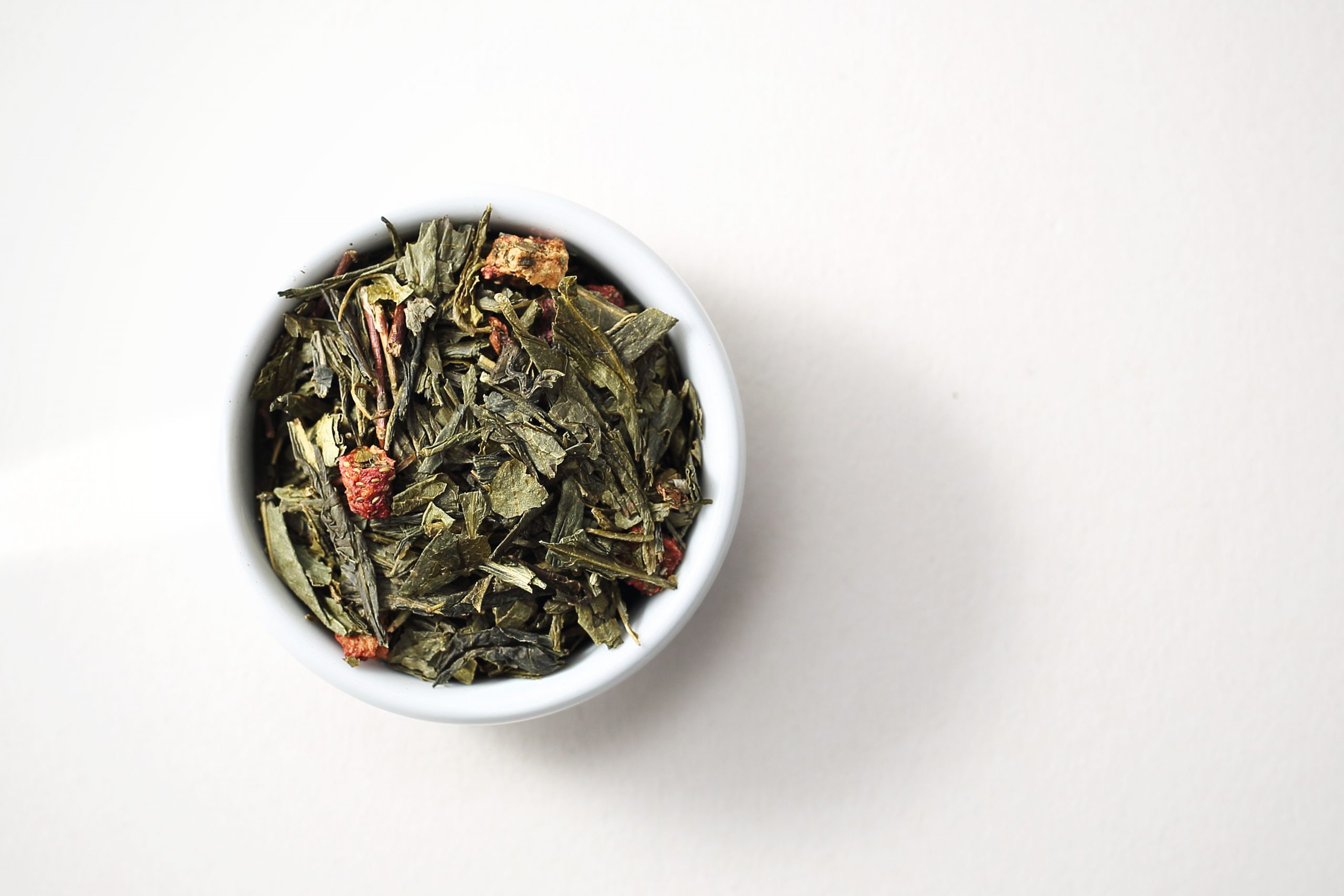 Sencha green tea, orange peel, freeze dried strawberries, cream flavouring.